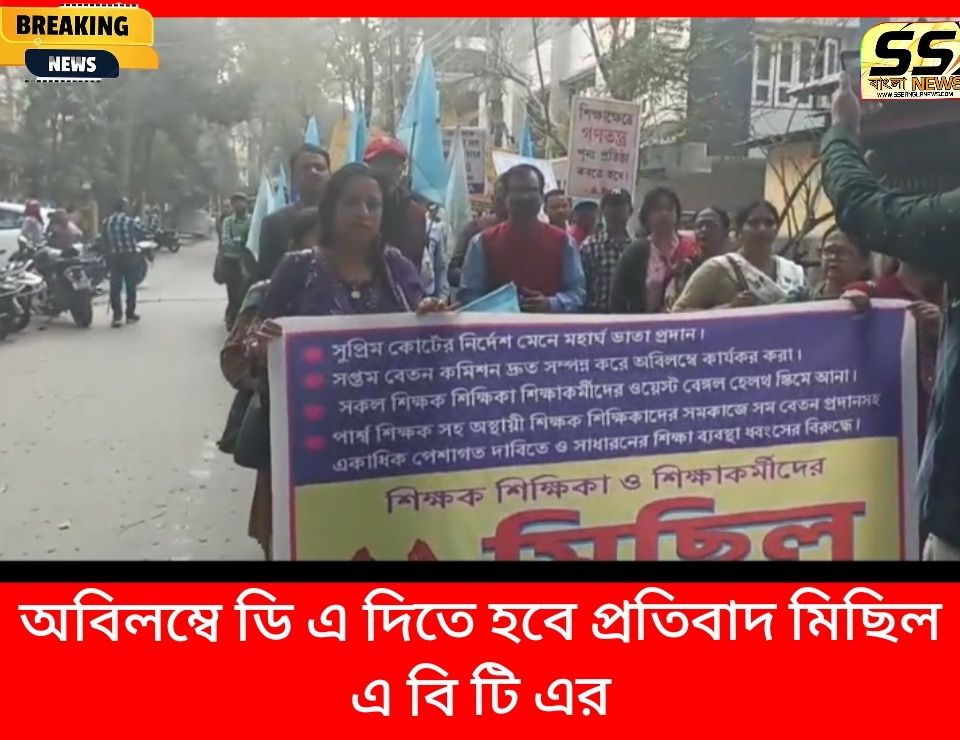 বকেয়া ডি এ যত তাড়াতাড়ি সম্ভব রাজ্য সরকারকে দিতে হবে। আজকে শিলিগুড়ির কলেজ পাড়াতে এবিটির শিক্ষক সংগঠন এক বিক্ষোভ মিছিল শুরু করল। তাদের সংগঠনের পক্ষ থেকে জানানো হয়েছে দিনের পর দিন রাতের পর রাত তাদের বঞ্চিত করছে রাজ্য সরকার। অবিলম্বে রাজ্য সরকারকে নিজের সিদ্ধান্ত বদলে ফেলতে হবে। সরকারি কর্মচারীদের প্রাপ্য টাকা দিতে এত দেরি করছে কেন রাজ্য সরকার? কেন দেওয়া হচ্ছে না তাদের প্রাপ্য টাকা? এইভাবে কতদিন আর নষ্ট করা হবে? এরপরে আমরা অনশনে নামতে বাধ্য হব জানালেন আন্দোলনকারীরা।