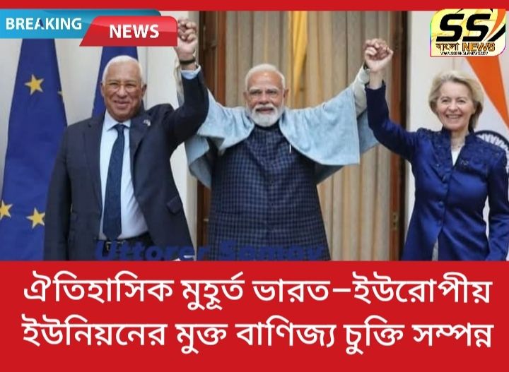 May be an image of text that says 'BREAKING NEWS SS আাংল সা NEE ঐতিহাসিক মুহূর্ত ভারত- ভারত-ইউরোপীয় পীয় ইউনিয়নের মুক্ত বাণিজ্য চুক্তি সম্পন্ন'