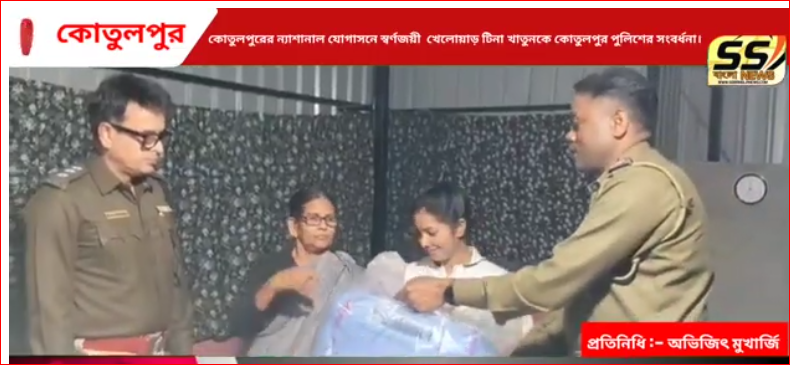 কোতুলপুরের ন্যাশানাল যোগাসনে স্বর্ণজয়ী খেলোয়াড় টিনা খাতুনকে কোতুলপুর পুলিশের সংবর্ধনা।