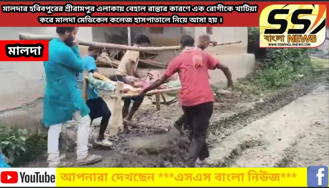 শ্রীরামপুর এলাকায় বেহাল রাস্তার কারণে রোগীকে খাটিয়া করে মালদা মেডিকেল হাসপাতালে নিয়ে আসা হয়।।